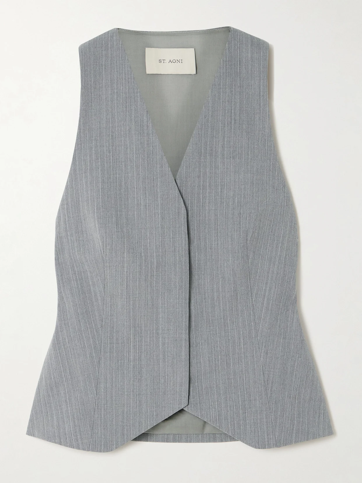 ST. AGNI's 'less is more' approach to design results in timeless staples you can depend on. Tailored from wool-blend twill, this vest is patterned with subtle pinstripes and finished with a notched hem. Wear yours with the coordinating shorts and mules. Lower-Impact Materials. This product is made using at least 50% lower-impact materials or ingredients. Find out more about our NET SUSTAIN criteria here.