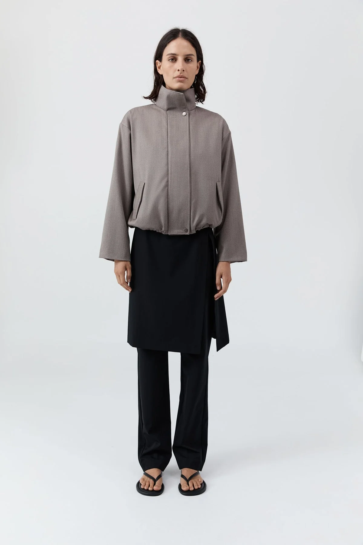 The Oupa Flight Jacket is a refined take on a utilitarian classic, offering a relaxed silhouette ideal for transitional layering. Cut from a premium wool blend, the Oupa Flight Jacket features a stand collar, ribbed cuffs and front pockets. An internal drawcord hem with toggle allows for adjustable shape, balancing everyday function with elevated design. Pair effortlessly with the Oupa Pintuck Pants for an elevated ensemble. DETAILS Materials - 95% Wool / 5% Polyester - Lining: 100% TENCEL™ Lyocell Garment Details - Stand collar, center-front zipper with press studs, front flap pockets, internal drawcord hem with toggle, ribbed cuffs, lined - Relaxed fit Manufacturing - SMETA Sedex Ethical Audit - Manufacturer has signed the St. Agni Code of Conduct - Responsibly made in China CARE - Dry clean only - Do not bleach - Do not tumble dry - Iron on low temperature with cloth
