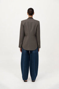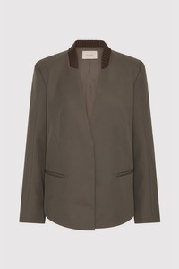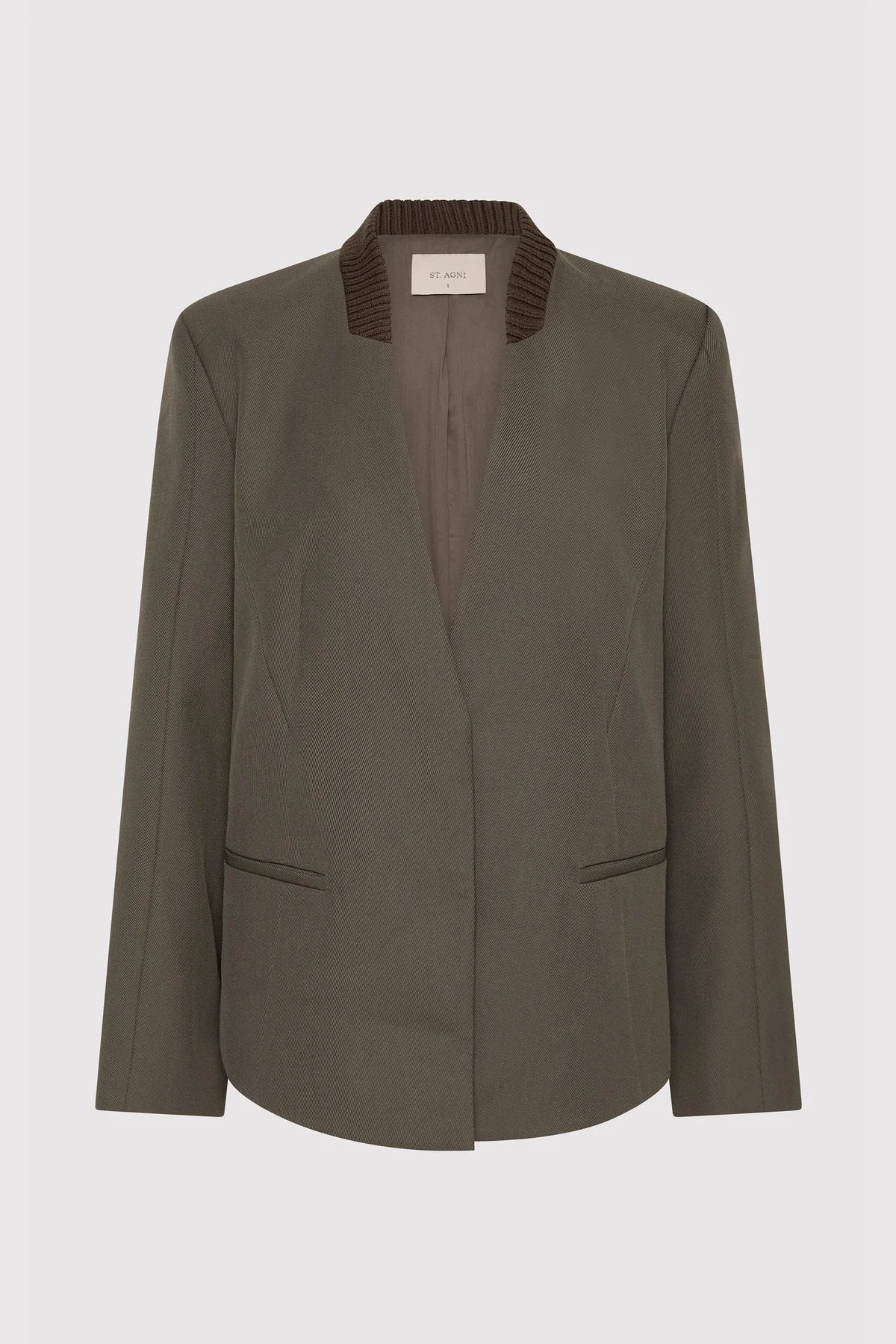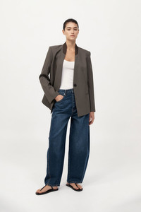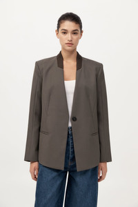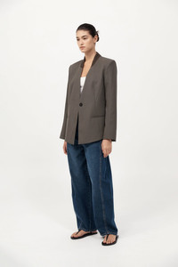 The Rib Collar Blazer is tailored for a structured silhouette, crafted from a soft wool blend. Featuring a contrast ribbed collar, shoulder pads and front welt pockets, the Rib Collar Blazer balances classic tailoring with contemporary detail. Pair with the Utility Pocket Pants or Utility Pocket Mini for a cohesive, polished look. DETAILS Materials - Body: 50% RWS Wool / 50% Recycled Polyester - Lining: 100% Lyocell - Collar Trim: 53% Viscose / 47% Recycled Polyester - RWS Wool Certificate - Recycled Polyester (GRS) Certificate Garment Details - Contrast ribbed collar, shoulder pads, front welt pockets, hidden button fastening, back panel detail, raglan sleeve detail, keyhole detail on cuffs, lined Manufacturing - Fairwear Audit - Manufacturer has signed the St. Agni Code of Conduct - Responsibly made in China CARE - Dry clean only - Do not bleach - Do not tumble dry - Iron on low temperature
