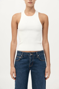 The Sculpted Knit Top features a sleek tank silhouette with a crew neckline and clean, sleeveless finish. Shaped with subtle contouring, it offers a refined base layer or standalone piece, crafted for ease and structure in equal measure. DETAILS Materials - 68% FSC Viscose - 32% Recycled Nylon - FSC Certificate - Recycled Polyester (GRS) Certificate Garment Details - Crew-neckline, tank silhouette, sleeveless, shoulder straps, racer-back, hip length Manufacturing - SMETA Sedex Ethical Audit - OEKO-TEX Standard 100 Certification - Responsibly made in Vietnam CARE - Do not machine wash - Wash inside out - Cold hand wash - Do not soak - Do not bleach - Do not tumble dry - Cool iron - Dry flat in shade - Gentle dry clean