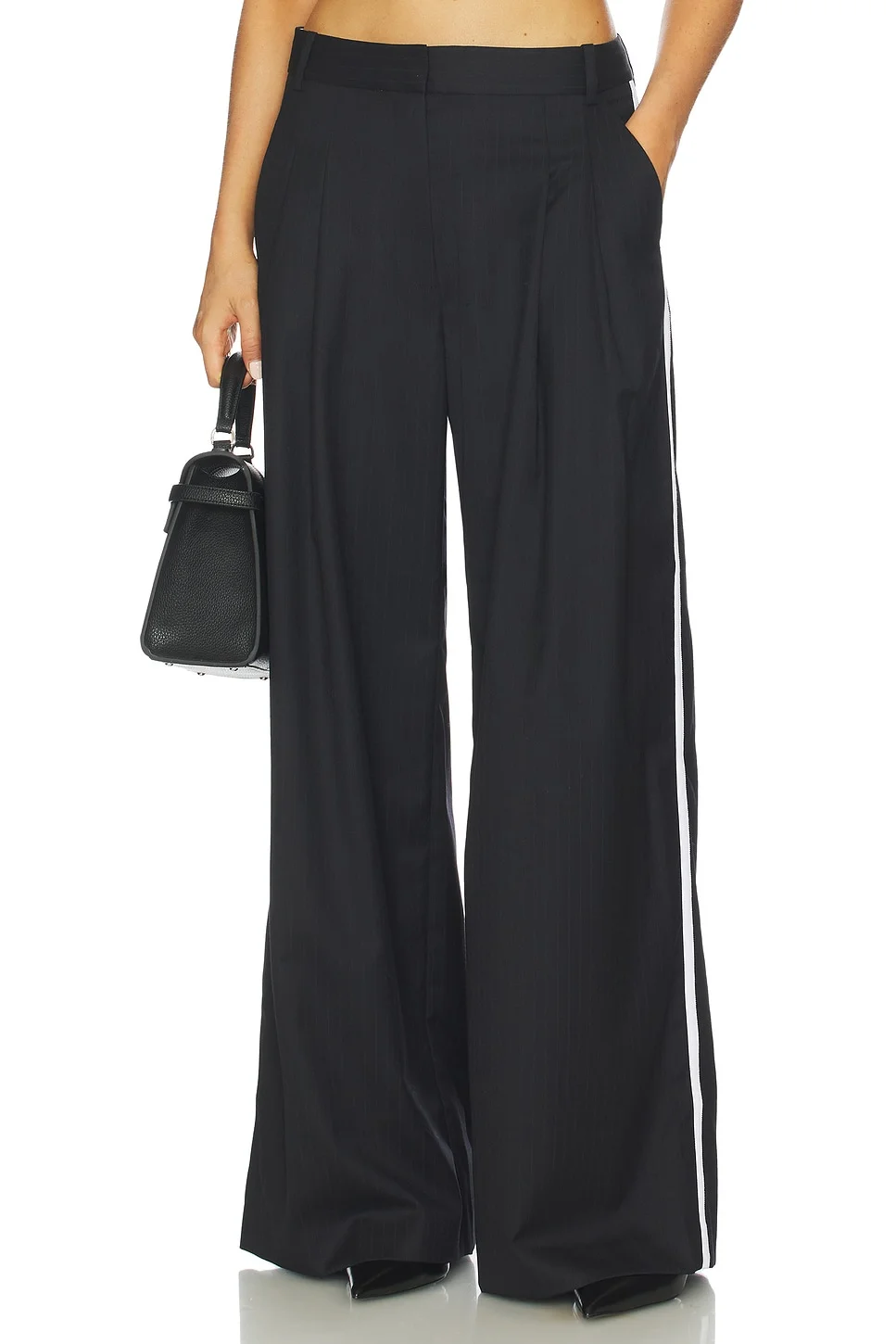 - Self: 50% wool 50% recycled polyester Contrast Fabric: 100% polyester - Dry clean only - Zip fly with hook and bar closure - Side seam and back faux welt pockets - Pleated design - Midweight twill fabric - Item not sold as a set.26" at the leg opening - Revolve Style No. SAGN-WP19 - Manufacturer Style No. W25-518BPS