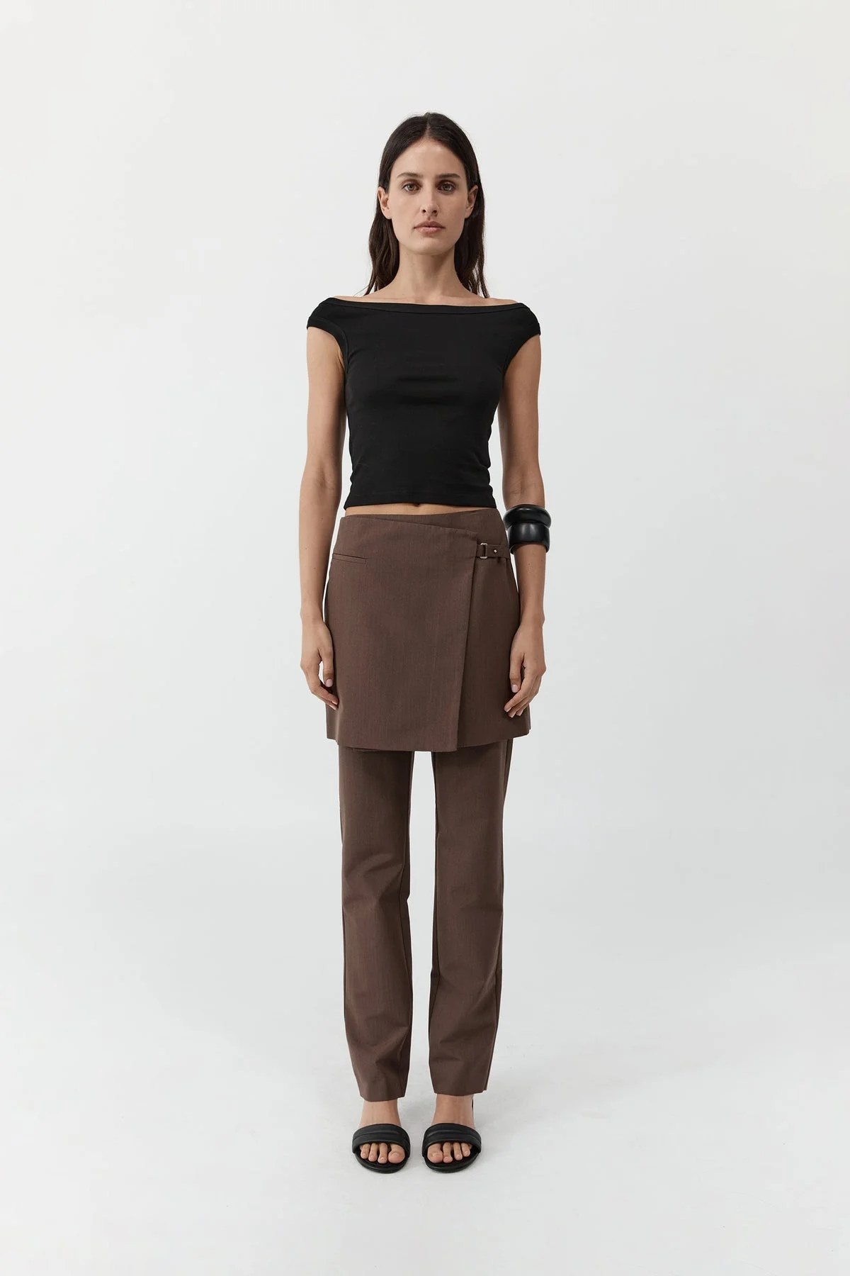 The Silk Canvas Wrap Skirt is cut with precision and restraint. Crafted from a refined silk canvas, the Silk Canvas Wrap Skirt sits at a mid rise and falls to a mini length. The wrap silhouette is secured with a subtle tab and stud detail, while a back dart shapes the body with subtle structure. Wear alone or layer over the 90s Minimal Pants for an elevated look. DETAILS Materials - 87% RWS Wool / 13% Silk - RWS Wool Certificate Garment Details - Mid rise, mini length, wrap silhouette with tab and stud detail, back dart, unlined - Tailored fit Manufacturing - Fairwear Audit - Manufacturer has signed the St. Agni Code of Conduct - Responsibly made in China CARE - Dry clean (P) - Do not bleach - Do not soak - Do not tumble dry - Iron on low heat under cloth