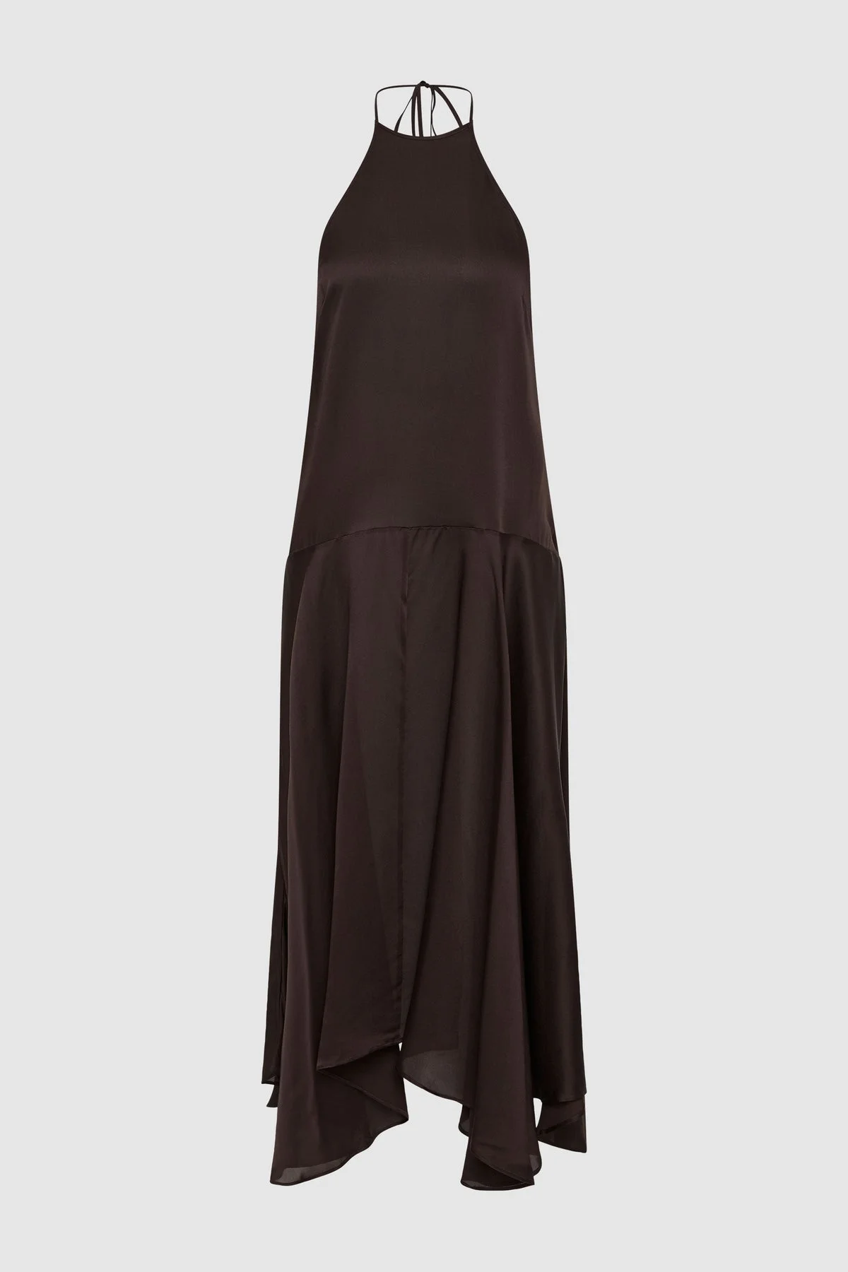 The Silk Handkerchief Halter Dress is an elevated silhouette, anchored by fluid draping. Cut from 100% Silk, featuring a halter neckline with fine rouleau ties and a sleeveless line that falls to a 7/8 length. Subtle front darts bring soft structure to the bodice, while a low seam at the hip releases volume through the skirt. Finished with a low scooped back and an irregular handkerchief hem. DETAILS Materials - 100% Silk Garment Details - 7/8 length, halter neckline, sleeveless, thin rouleau ties, front darts, lower hip seam detail, low scooped back, handkerchief hem, unlined - Slim fit Manufacturing - SMETA Sedex Ethical Audit - OEKO-TEX Standard 100 Certification - Manufacturer has signed the St. Agni Code of Conduct - Responsibly made in China CARE - Dry clean (P) - Do not bleach - Do not soak - Do not tumble dry - Iron on low heat under cloth
