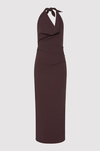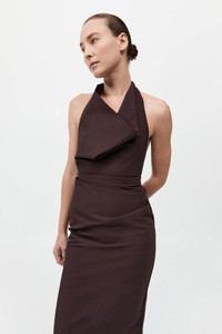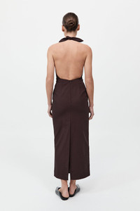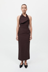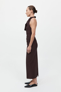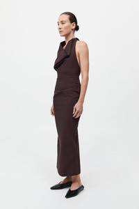 The Structural Tie Dress is cut to a column silhouette that falls to a maxi length, featuring a structured halter neckline. Designed to hug the figure in a flattering embrace, the Structural Tie Dress is finished with an open back for an elevated touch. DETAILS Materials - 70% Recycled Polyamide / 30% Organic Cotton - Lining: 100% Lyocell - Recycled Polyester (GRS) Certificate - Organic Content Standard (OCS) Certificate Garment Details - Halter neck, structured cowl neck, column silhouette, back vent, centre back invisible zip, back darts, maxi length - Slim fit Manufacturing - Manufacturer has signed the St. Agni Code of Conduct - Fairwear Audit - OEKO-TEX 100 Certification - Responsibly made in China CARE - Cool gentle machine wash - Wash with similar colours - Do not bleach - Do not tumble dry - Iron on low temperature