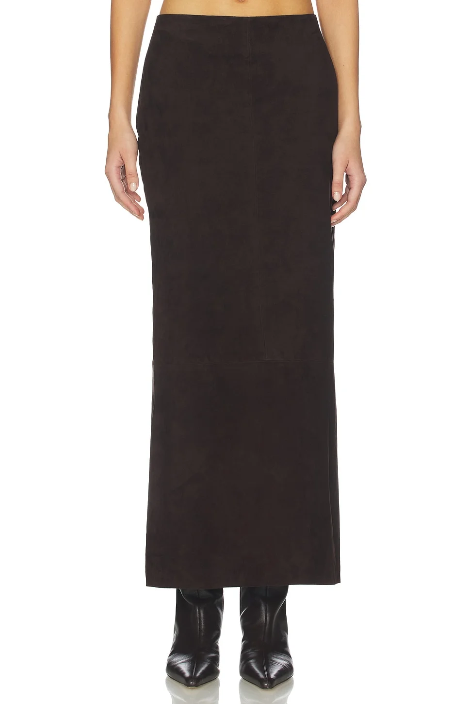 - 86% cotton 31% recycled nylon 3% spandex - Made in India - Professional leather cleaning - Fully lined - Back zip closure - Genuine suede fabric - Back vent - Skirt measures approx 37" in length - Revolve Style No. SAGN-WQ16 - Manufacturer Style No. R26-805COF