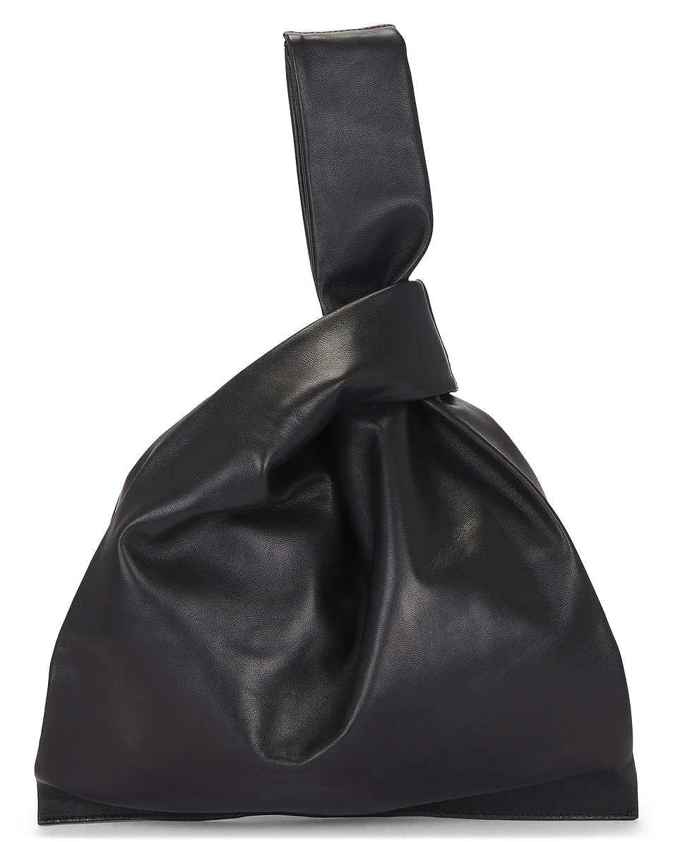 Details - 100% Bovine Leather - Made in India - Top magnetic snap closure - One main compartment - Interior slip pocket - Cotton lining - Asymmetric strap that loops through to create a subtle knot effect - Measures approx 30 cm W x 30 cm H x 15 cm D - with a 15 cm drop on longer handle - Our Style No. SGNF-WY45 - Manufacturer Style No. R26-005BLK