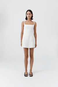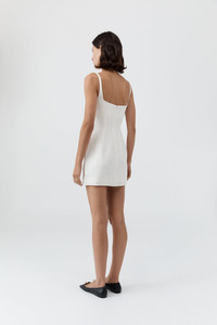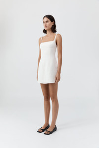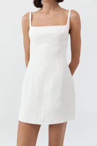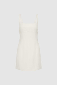 The Tailored Square Neck Mini Dress offers a structured silhouette in a mini length, ideal for warmer weather dressing. Crafted from 100% linen and lined with TENCEL™ Lyocell for breathable comfort and an elevated hand feel. Featuring a fitted bodice and completed with front and back darts for subtle structure. DETAILS Materials - 100% Linen - Lining: 100% - TENCEL™ Lyocell - European Flax LENZING™ TENCEL™ Certificate Garment Details - Mini length, square neckline, sleeveless, thin straps, fitted bodice, center bust seam, front and back darts, center-back invisible zip, lined - Tailored fit Manufacturing - SMETA Sedex Ethical Audit - Manufacturer has signed the St. Agni Code of Conduct - Responsibly made in China CARE - Dry clean only - Do not bleach - Do not tumble dry - Warm iron with cloth