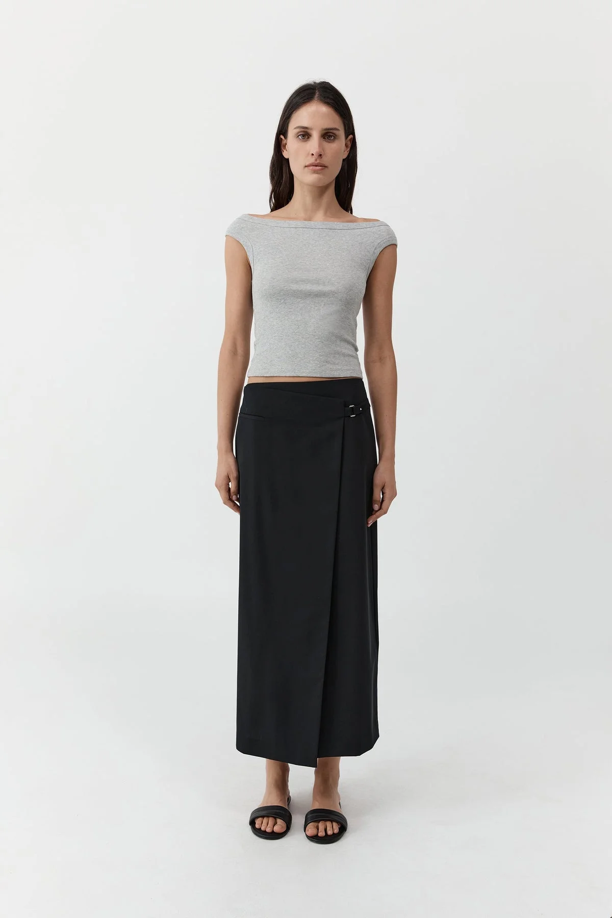 The Tailored Wrap Skirt is cut with precision, offering a clean, sculpted silhouette. Designed with a mid-rise waist and a 7/8 length, the Tailored Wrap Skirt features a wrap construction secured with a subtle tab and stud detail. A back dart refines the shape through the body, enhancing the tailored fit. Crafted from premium, responsibly sourced wool, the Tailored Wrap Skirt is quietly structured and considered in form. DETAILS Materials - 100% RWS Wool - RWS Wool Certificate Garment Details - Mid rise, 7/8 length, wrap silhouette with tab and stud detail, back dart, unlined - Tailored fit Manufacturing - Fairwear Audit - Manufacturer has signed the St. Agni Code of Conduct - Responsibly made in China CARE - Dry clean only - Do not bleach - Do not tumble dry - Iron on low temperature