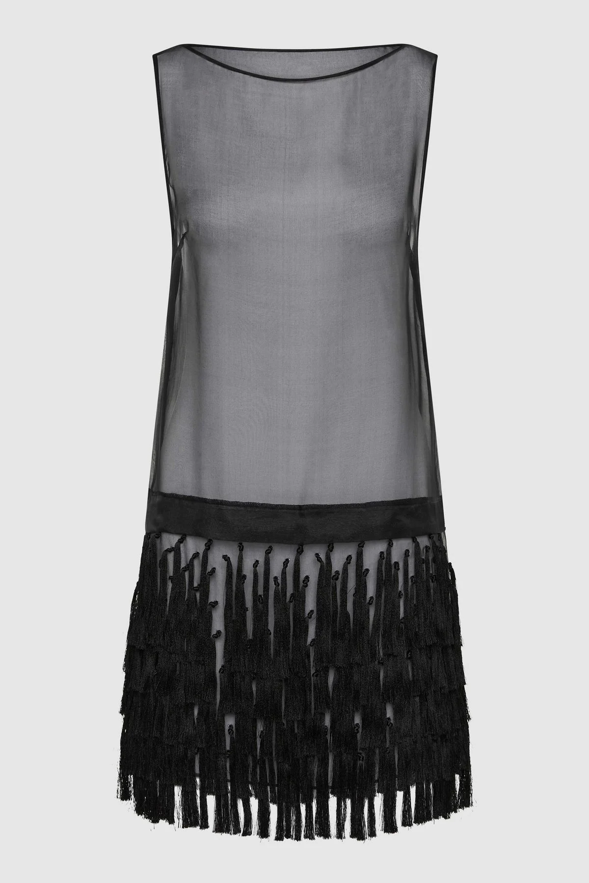 Crafted from 100% silk, the Tassel Shift Mini Dress features a sheer base intricately adorned with delicate tassels for dynamic texture and movement. Designed with a bateau neckline and a shift silhouette, it offers a relaxed fit that can be styled effortlessly as either a tunic top or a mini dress. DETAILS Materials - 100% Silk - Tassels: 100% Viscose Garment Details - Bateau neckline, shift silhouette, sheer, tassels, unlined - Relaxed fit Manufacturing - SMETA Sedex Ethical Audit - Manufacturer has signed the St. Agni Code of Conduct - Responsibly made in China CARE - Dry clean