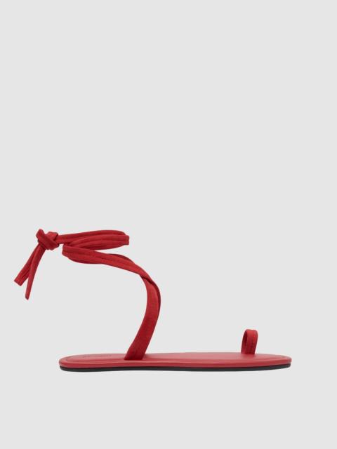 The Tie Up Flat combines artisanal detailing with laid-back elegance. Featuring slender suede straps that wrap around the ankle and a supportive toe strap, the Tie Up Flat is grounded by a cushioned sole. A refined yet effortless sandal for everyday wear. DETAILS Materials - Upper: 100% Calfskin Leather - Insole: 100% Calfskin Leather - Outsole: 100% Rubber - Leather Working Group (LWG) Certified Garment Details - Wrap style sandal, suede straps with stitch detail, toe strap, soft padded insole Manufacturing - BSCI Social Audit - Manufacturer has signed the St. Agni Code of Conduct - R - esponsibly made in China SIZING - Heel height: 0.5cm CARE Natural Leather Protector is recommended before wear. Keep out of direct sunlight to avoid fading and avoid wet weather. Marks and variations in the leather are not considered a fault but are inherent to the natural beauty and uniqueness of the leather. When not in use we advise to store your St. Agni product in its protective bag and to occasionally treat it with a leather conditioner to keep it hydrated.