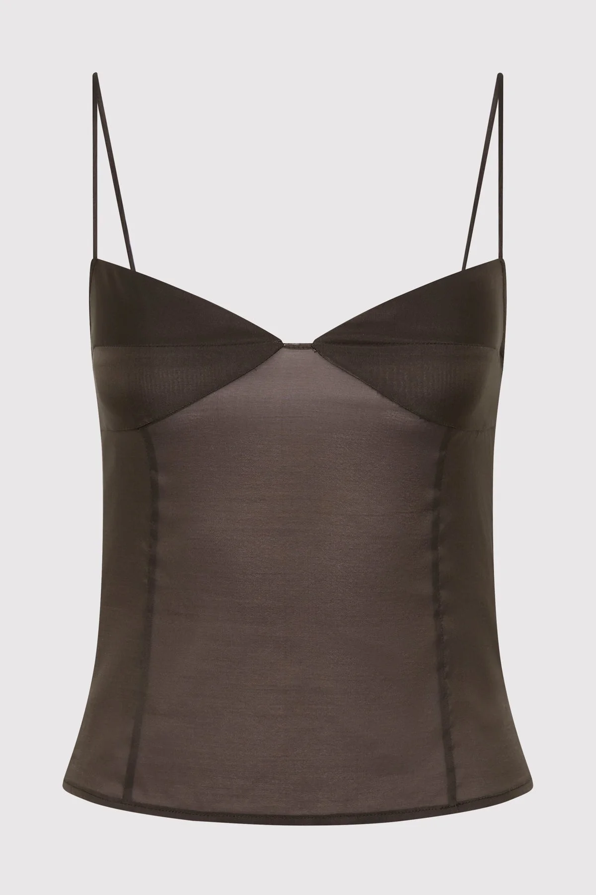 The Transparent Silk Cami is a refined essential, featuring a sweetheart neckline, delicate thin straps and subtle panel detailing at the front and back. A nod to 90s lingerie, the Transparent Silk Cami blends femininity with modern minimalism. DETAILS Materials - 49% Silk - 42% Nylon - 9% Spandex Garment Details - Sweetheart neckline, sleeveless, thin straps, front and back panel detail, side seam invisible zip, slightly sheer, lined cups Manufacturing - SMETA Sedex Ethical Audit - Responsibly made in China CARE - Cold hand wash with like colour - Drip to dry in shape - Do not tumble dry - Do not bleach - Cool iron on reverse or use a pressing pad - Dry clean (P)