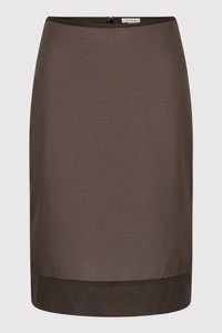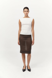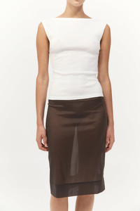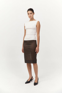 The Transparent Skirt is designed with a mid-rise waist and knee-length silhouette. Featuring back darts, a centre-back invisible zip, and a hem split for ease of movement, its sheer fabrication offers a directional layer to elevate minimalist styling. Pair with the Transparent Silk Cami for a refined look. DETAILS Materials - 49% Silk - 42% Nylon - 9% Spandex Garment Details - Mid-rise, knee length, back darts, center-back invisible zip, center-back hem split, sheer, unlined Manufacturing - SMETA Sedex Ethical Audit - Responsibly made in China CARE - Cold hand wash with like colour - Drip to dry in shape - Do not tumble dry - Do not bleach - Cool iron on reverse or use a pressing pad - Dry clean (P)