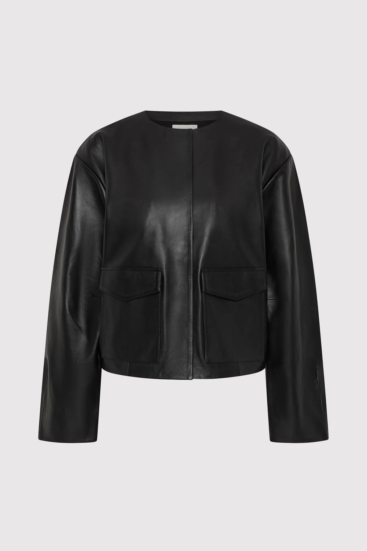 The Utility Cocoon Leather Bomber offers a sleek, contemporary take on utilitarian outerwear. Crafted from supple 100% lambskin and lined with 100% TENCEL™ Lyocell, it features a collarless crew neckline and relaxed cocoon silhouette. Front, back, and sleeve darts lend subtle structure, while concealed magnetic buttons complete the streamlined finish. DETAILS Materials - 100% Lambskin Leather - Lining: 100% TENCEL™ Lyocell - Leather Working Group (LWG) Certified Garment Details - Crew neckline, concealed magnetic buttons, cocoon silhouette, front and back darts, front flap patch pockets, raglan sleeve with darts, lined Manufacturing - SGS Social Accountability - 8000 Audit Certification - Manufacturer has signed the St. Agni Code of Conduct - Responsibly made in India CARE Natural Leather Protector is recommended before wear. Use a good quality leather conditioner or protective spray to treat the product to increase its durability. Regularly clean leather with a soft brush or cloth, regularly air out leather, and where possible do not get leather wet. Blot away water or moisture as soon as possible, do not immerse leather in water to clean, do not dry wet leather with artificial heat like a radiator or hairdryer, do not machine wash leather, do not tumble dry leather, do not iron leather. Keep out of direct sunlight to avoid fading and avoid wet weather. Marks and variations in the leather are not considered a fault but are inherent to the natural beauty and uniqueness of the leather. When not in use we advise to store your St. Agni product in its protective bag and we recommend to continually treat it with a leather conditioner to keep it hydrated for a long life.