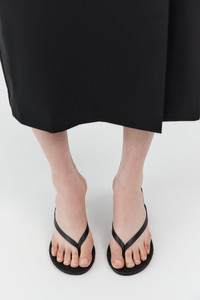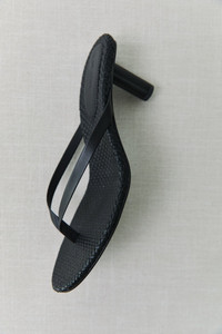 The Woven Thong Heel features a sculptural cylinder heel with slim leather stitched thong straps and a grid-stitched leather insole. A refined warm-weather staple for considered dressing. DETAILS Materials - Upper: 100% Lambskin Leather - Lining: 100% Lambskin Leather - Insole: 100% Calfskin Leather - Outsole: 100% Bovine Leather - Leather Working Group (LWG) Certificate - Chrome free dyed Garment Details - Cylinder heel, slim leather thong straps, woven leather insole Manufacturing - BSCI Social Audit - Manufacturer has signed the St. Agni Code of Conduct - Responsibly made in China SIZING - Heel height: 5.8cm CARE - Gently wipe clean with a soft cloth when needed - Apply a leather protector of your choice before wear to help guard against the elements - Protective sole stickers may be applied if desired - Avoid prolonged exposure to water. If wet, allow to air dry naturally – away from direct heat or sunlight - Store in a cool, dry place inside the breathable dust bag provided - Keep out of direct sunlight and humid environments - To maintain shape, use shoe forms or gently stuff with tissue when storing - Rotate between wears to allow your footwear time to breathe and recover