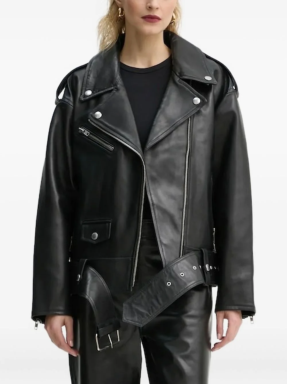 belted zip-front leather jacket Highlights - Black - Leather construction - Zip fastening - Belted waist - Snap button detailing - Multiple pockets Imported Composition Calf Leather 100%, Polyester 95%, Viscose 5% Washing instructions Read Manufacturer Guidelines