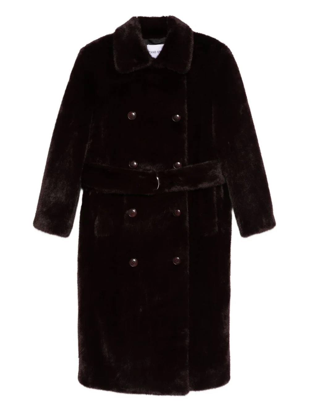 button belted-waist coat Highlights - Dark brown - Double-breasted - Button fastening - Notched lapels - Belted waist - Front pockets Imported Composition Lining: Polyester 55%, Viscose 45% Outer: Polyester 100% SIZE & FIT Model measurements Height 5 ft 9 in(1.76 m) Bust/Chest 31.49 in(80 cm) Hips 35.43 in(90 cm) Waist 23.62 in(60 cm) Washing instructions Read Manufacturer Guidelines