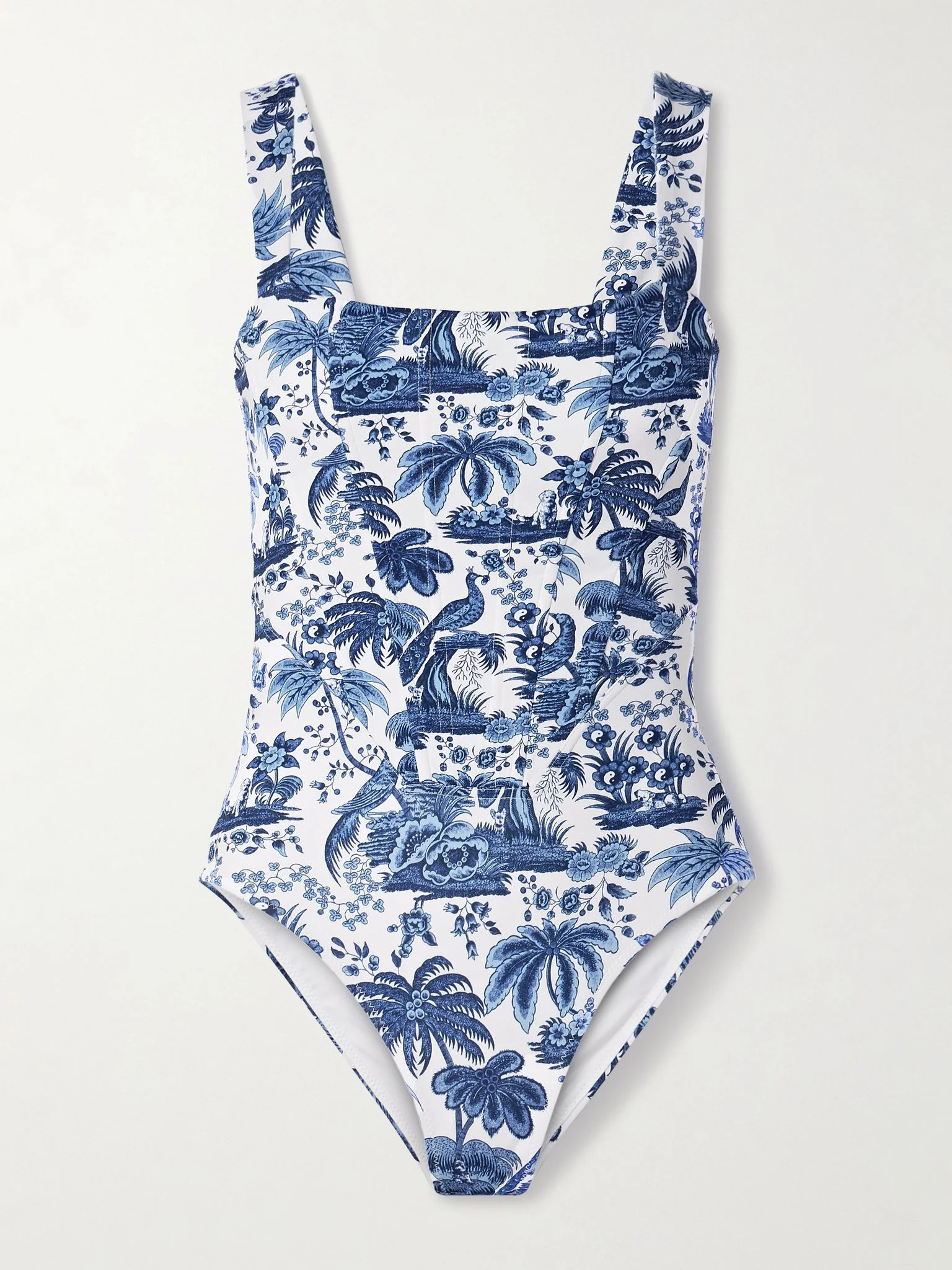 STAUD's 'Adelaide' swimsuit is printed with an intricate, French toile-inspired motif featuring pretty blooms and animals. It's made from panels of recycled stretch fabric and fitted with internal boning for light support and structure. Size & Fit - Fits true to size, take your normal size - Medium brief coverage - Model is 183cm/ 6'0", bra size 34B and is wearing a size Small Model measurements: - Bust: 76cm/ 30" - Waist: 64cm/ 25" - Hip: 95cm/ 37.5" Details & Care - White and tonal-blue stretch recycled-polyester - Hook and zip fastening at back - 67% recycled polyester, 33% spandex; lining: 80% nylon, 20% spandex - Hand wash - Lotion, sunscreen, oil and chlorine can cause discoloration of this item; this is not a manufacturing defect. Please follow care instructions to keep your swimwear in the best condition