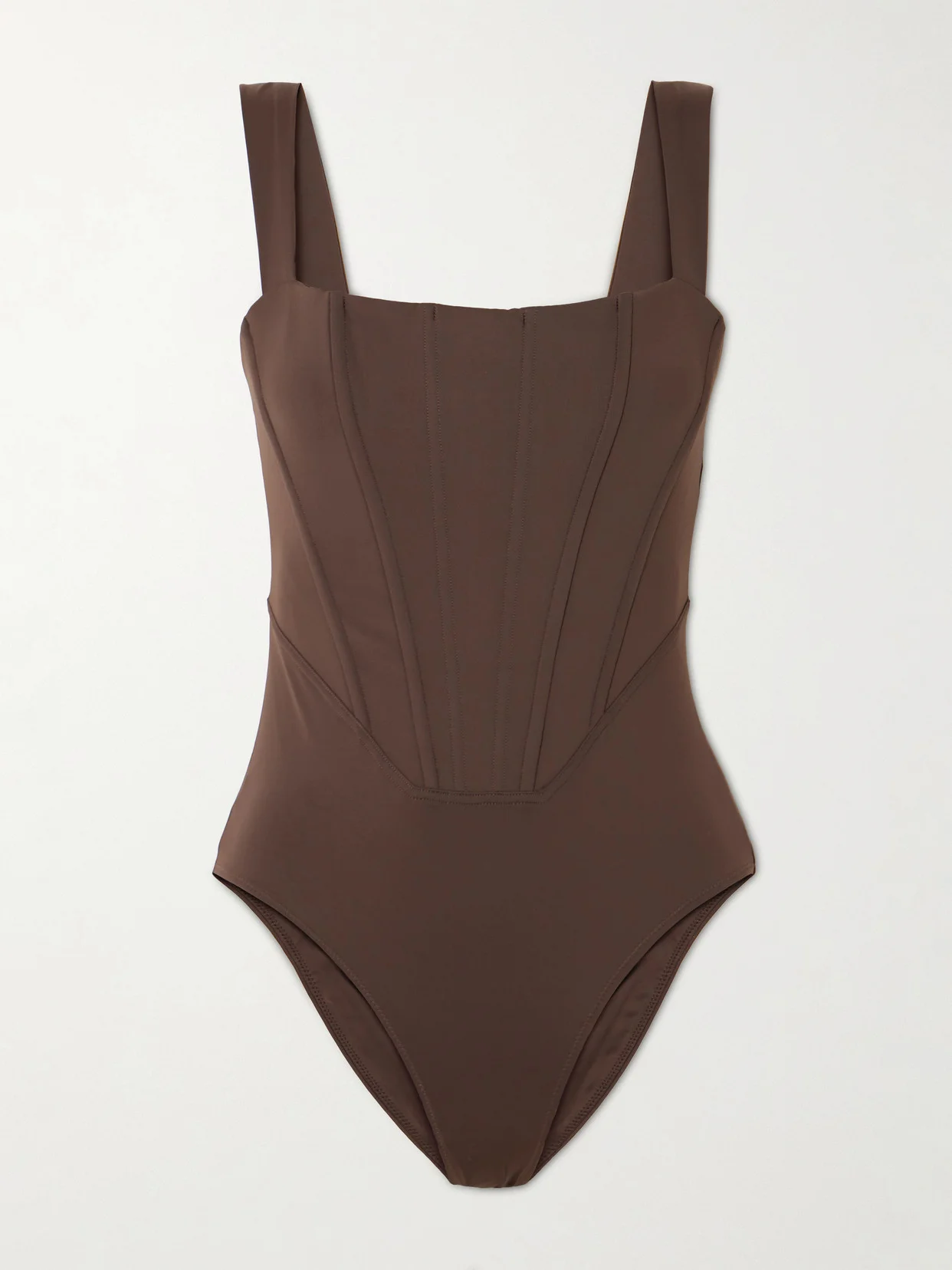 STAUD's 'Adelaide' swimsuit is defined by the supportive corset-inspired boning and on-trend 'Dark Chocolate' hue. Made from panels of stretchy fabric blended with 67% recycled fibers, it has wide shoulder straps and an elongated zip pull.