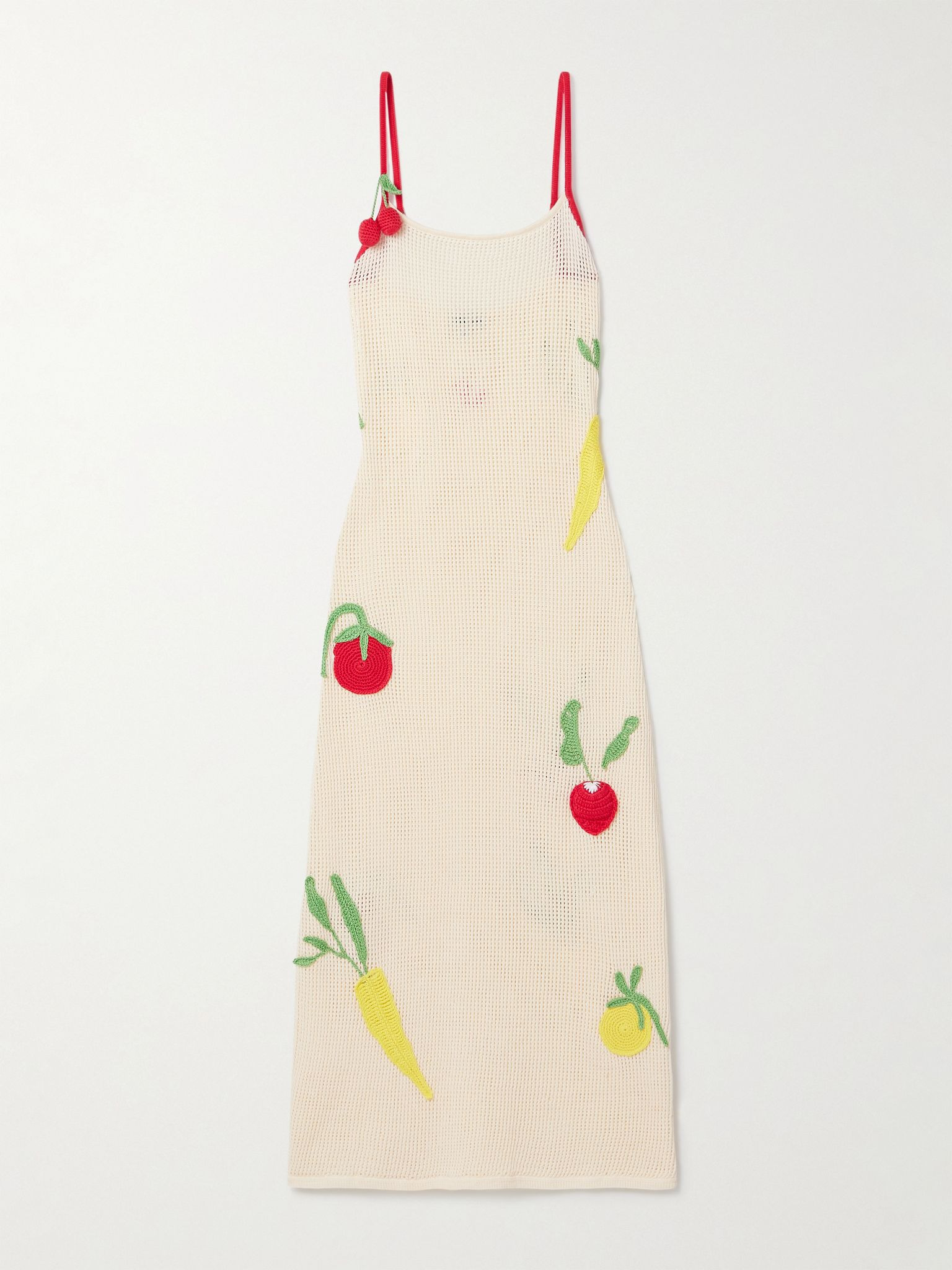 STAUD's 'Adeline' dress is appliqued with colorful fruits and vegetables inspired by farmers' markets. It's designed for a slim fit from crocheted cotton and has a pair of cherries dangling from the slim, adjustable straps. Size & Fit - Fits true to size, take your normal size - Intended for a slim fit - Lightweight, open knit - Model is 175cm/ 5'9" and is wearing a size Small Details & Care - Ivory cotton - Slips on - 100% mercerized cotton - Hand wash