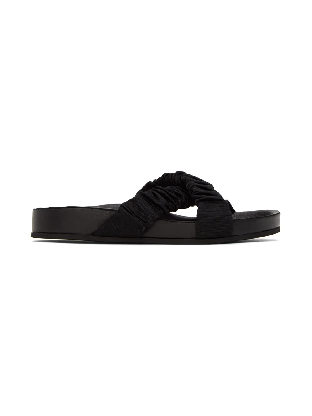 Grained nappa leather slip-on sandals in black. Ruching throughout. · Open round toe · Criss-crossing grosgrain straps at vamp · Logo embossed at molded footbed · Covered midsole · Textured rubber outsole Supplier color: Black Upper: leather. Sole: rubber. Made in Portugal 231386F124019