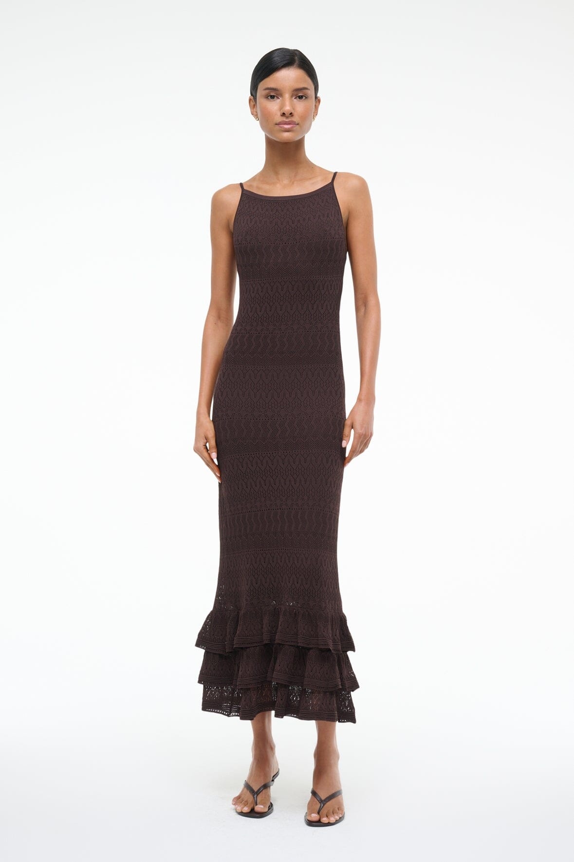 The Bliss Dress is a pointelle stitch knit dress is midi length, featuring spaghetti straps, sheer detailing throughout the skirt, and a ruffle at the hem. MORE DETAILS - 80% Viscose, 20% Nylon - Model is 5'9 and wearing a size S - Dry Clean Only