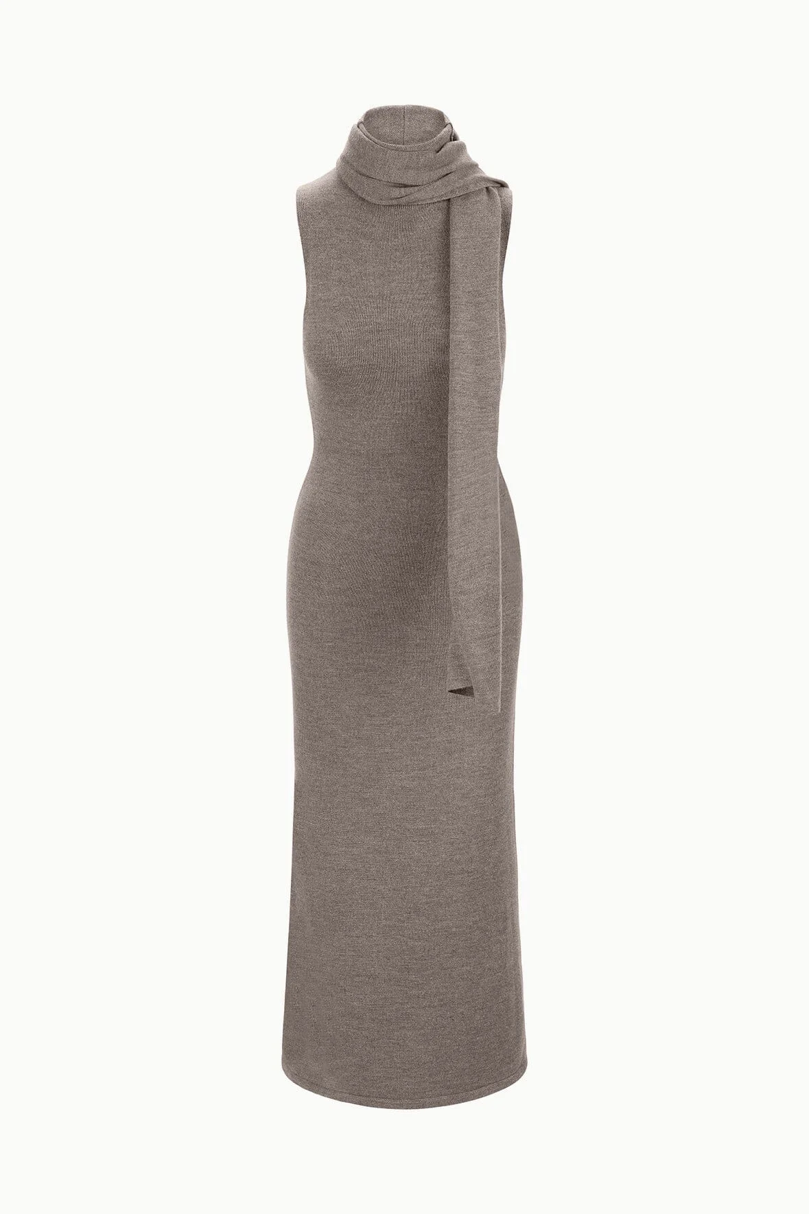 The Canal Midi Dress is a midi-length fitted sweater dress featuring a detachable scarf. This style features a roll neck turtleneck and a back seaming detail. MORE DETAILS - 100% Merino Wool - Model is 5'10 and wearing a size S - Dry Clean Only