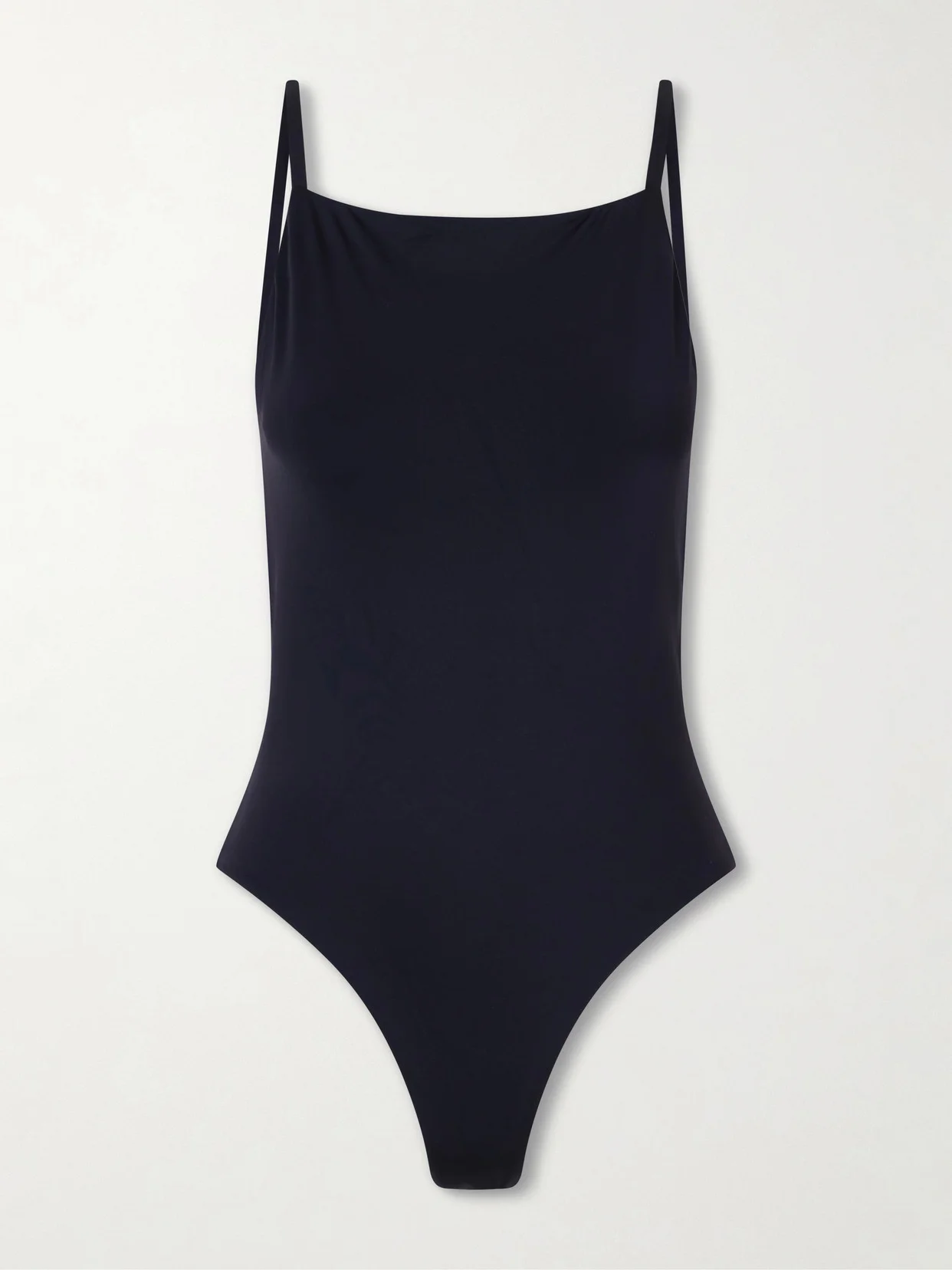 STAUD's 'Claudia' swimsuit is defined by its clean, understated design. Cut from stretch fabric, it contours the body for a smooth, sculpted fit. Its minimalist style makes it a versatile choice for both swimming and lounging by the pool.