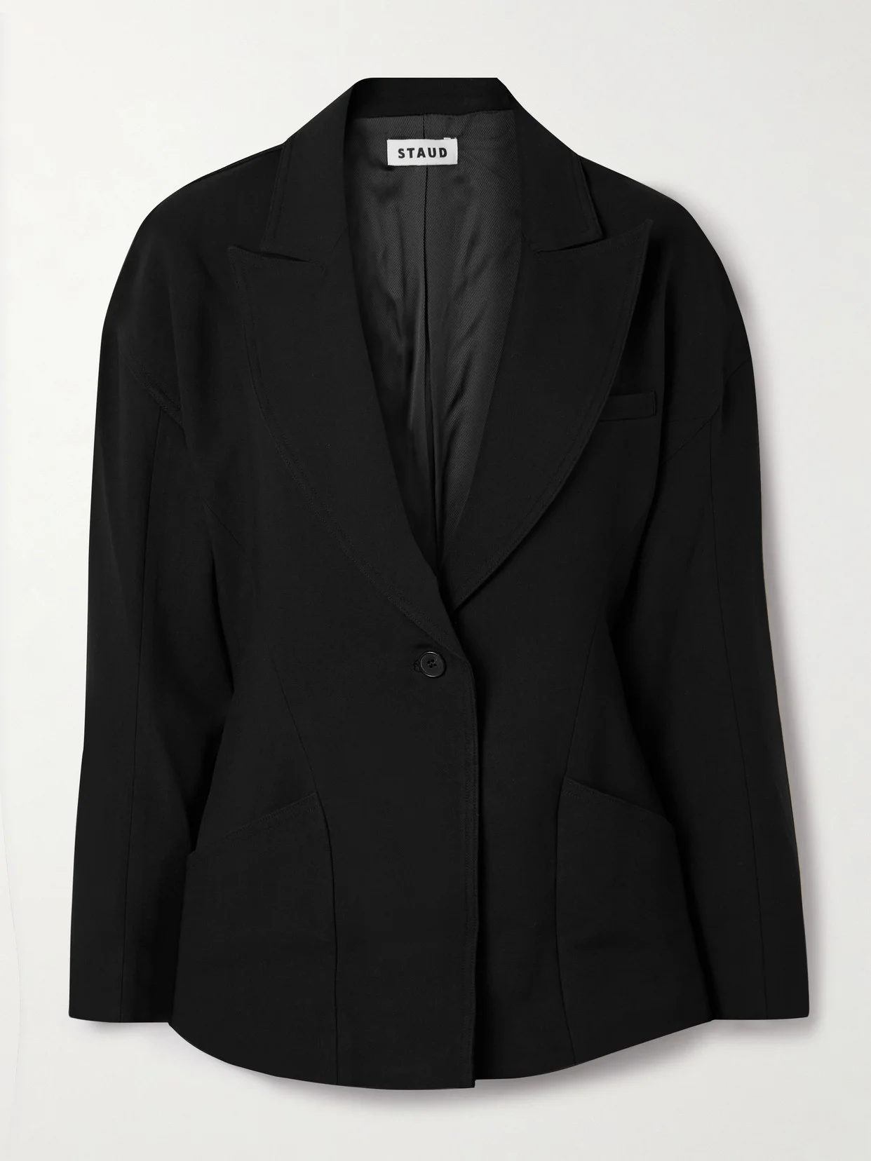 STAUD's 'Cole' blazer has a single button fastening and nipped-in waist that creates an hourglass shape. The peak lapels are so elegant, while the full satin lining ensures easy layering.