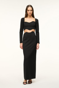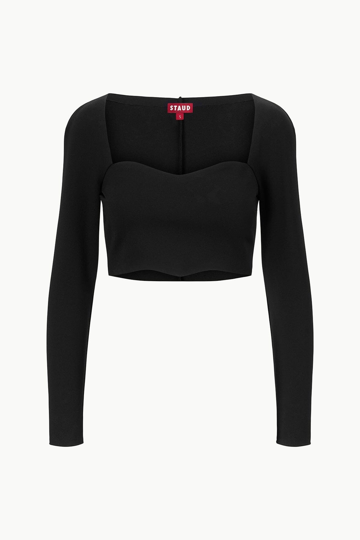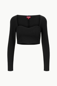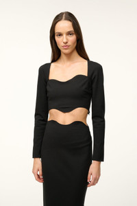 A long-sleeved crop top made from a stretchy ponte fabric. This style features a wave details at the neck and hem, and invisible zipper closure down the back. MORE DETAILS - 68% Rayon, 27% Nylon, 5% Spandex - Model is 5'10 and wearing a size S - Dry Clean Only