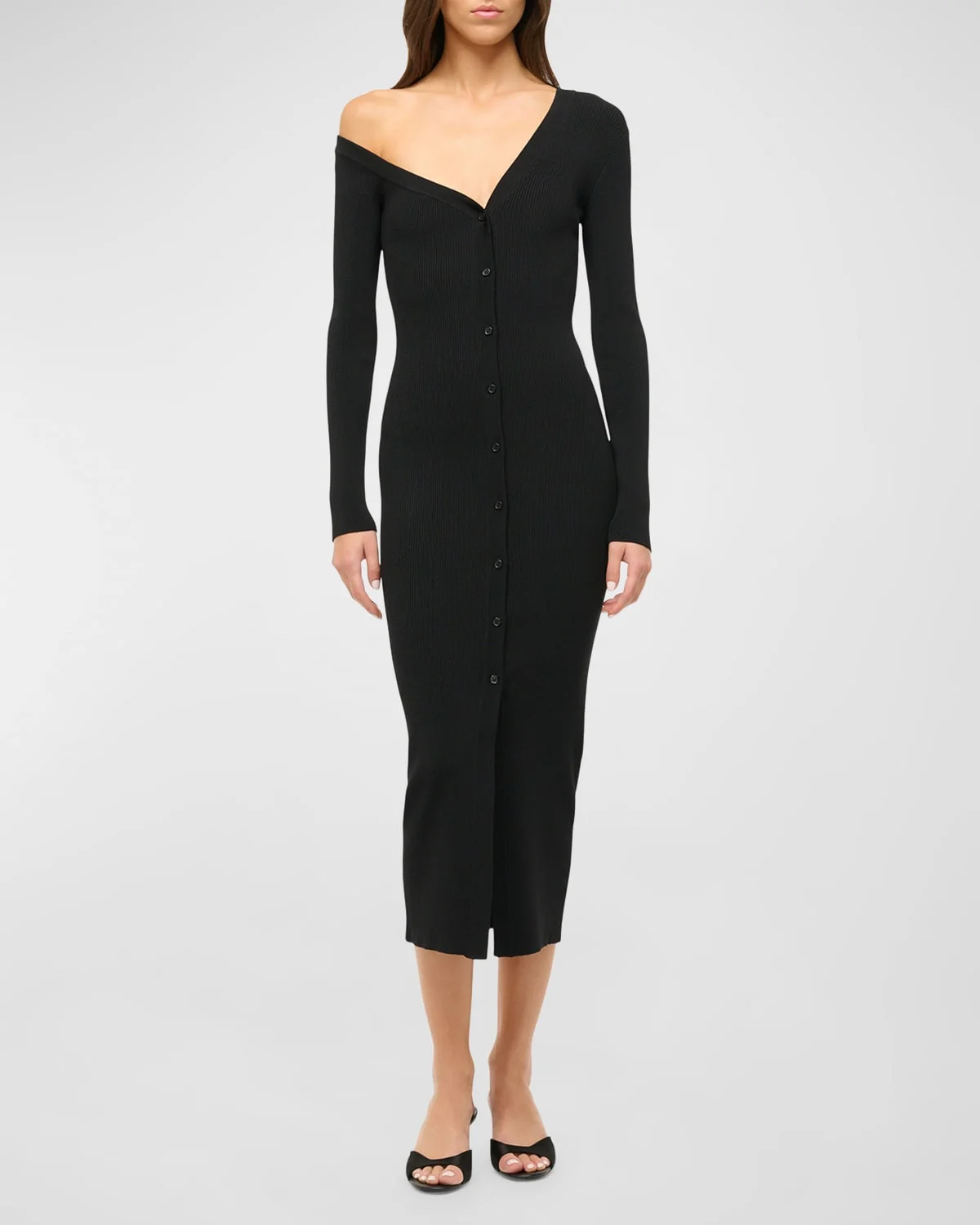 STAUD "Craftsman" cardiganstyle sweater dress Oneshoulder neckline; button placket Long sleeves Hem falls below the knee Sheath silhouette Viscose/nylon/elastane Dry clean Imported