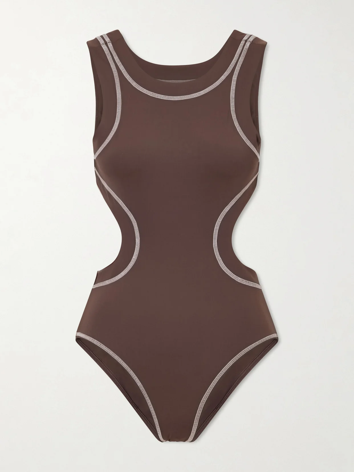 STAUD's 'Dolce' one-piece is designed with a high neckline and sculptural side cutouts that define the waist. Framed by contrast trim, it creates a graphic outline against the smooth stretch fabric. Wear it poolside with oversized sunglasses and simple slides.