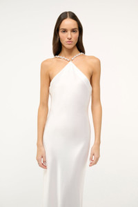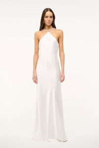 The Cadence is a floor length slip dress featuring a halter neckline with beaded straps. This dress is crafted in satin and has a hidden back zipper. MORE DETAILS - 76% Acetate, 24% Polyester - Model is 5'10 and wearing a size 2 - Dry Clean Only