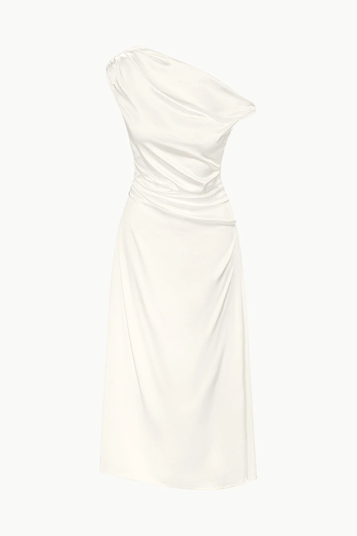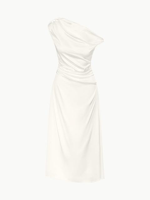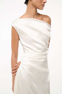 The Phare Dress features a draped off-the-shoulder neckline, a fitted waist and an ankle-grazing length. Updated in our stretch silk, this dress is perfect for a special occasion. MORE DETAILS - 93% Silk, 7% Spandex - Model is 5'10 and wearing a size 4 - Dry Clean Only