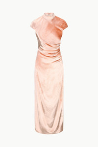 The Tina Dress is a mock neck gown with cap sleeves, asymmetric draping at the waist and an open back. MORE DETAILS - 88% Viscose, 12% Silk; Lining: 100% Polyester - Model is 5'10 and wearing a size 4 - Dry Clean Only