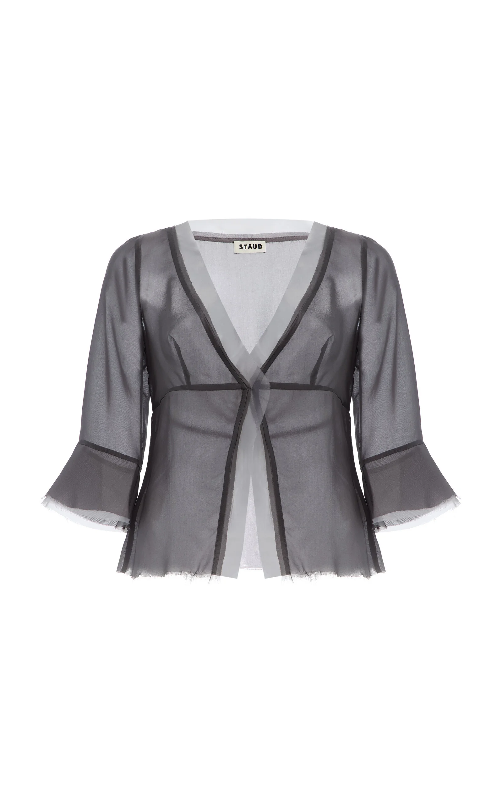 Sarah Staudinger and George Augusto co-founded the LA-based brand upon the idea that fashion shouldn't just empower women — it should be accessible, too. The 'Jenny' top has a gently gathered wrap silhouette made from layers of raw-edge silk georgette. PRODUCT DETAILS - Resort '26 - Slip on - Composition: 100% silk; Combo: 100% polyester - Designer color: Storm - Dry clean - Imported