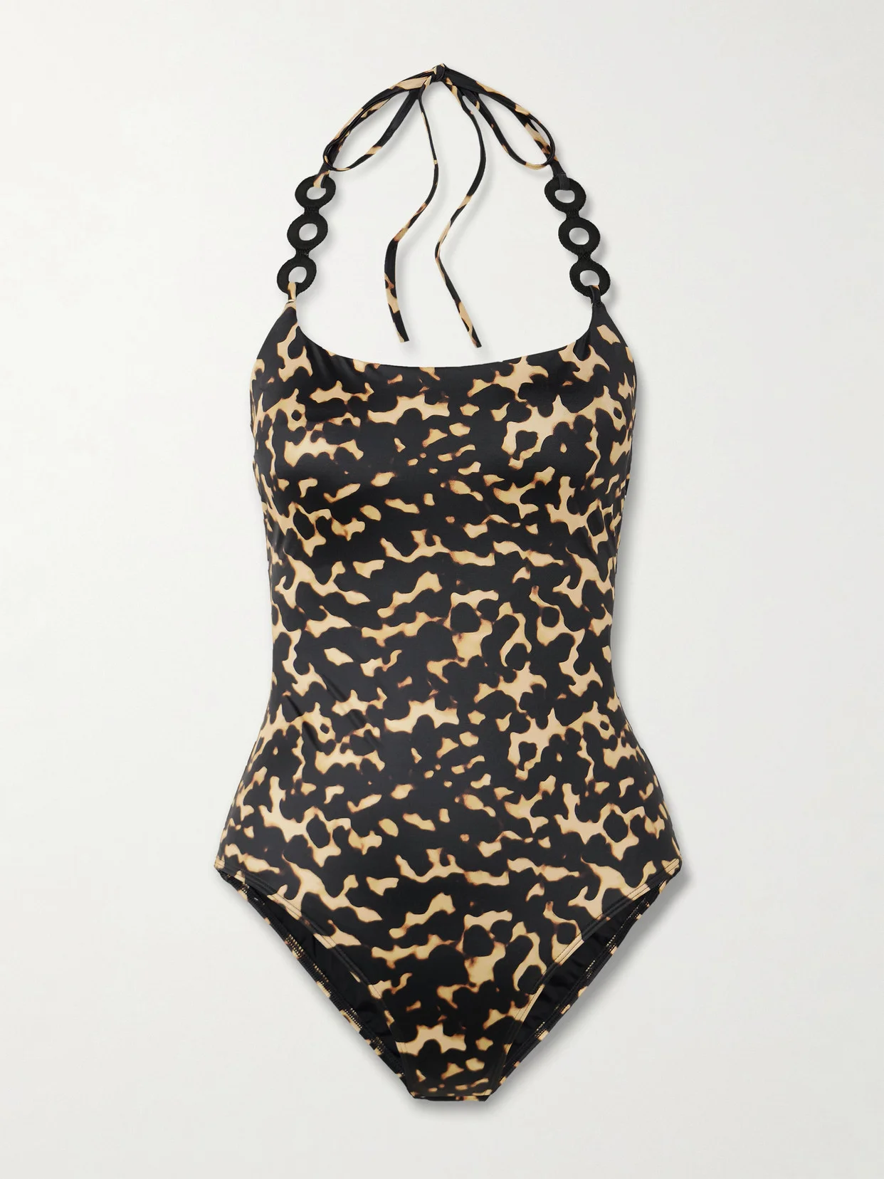STAUD's 'Laird' swimsuit is adorned with crocheted rings at the halterneck straps that lend a nautical feel. It's made from printed stretch fabric and has a scooped neckline.