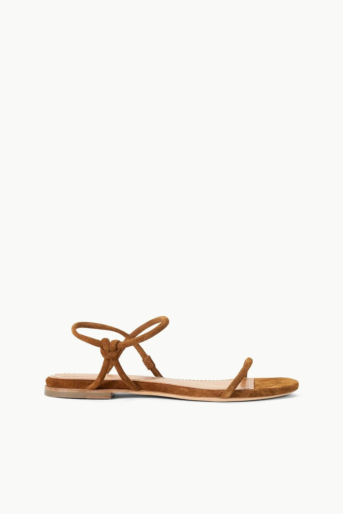 A flat suede sandal with tubular straps, the Laurel Sandal features a leather cord toe and ankle strap. MORE DETAILS - Leather Sandal - If between sizes, consider sizing up - Upper: 100% Goat Leather, Sole: 95% Cow Leather, 5%ABS - Heel Height: 10mm / .4in.