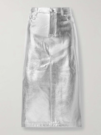EDITORS'NOTES STAUD's 'Oaklyn' midi skirt is cut from metallic faux leather with a touch of stretch. It's modeled after traditional denim styles - with the classic five pockets and exposed seams - and has a dramatic front slit that makes it easier to move. SIZE & FIT - Fits true to size, take your normal size - Midi-length, designed to be worn at the waist - Mid-weight, slightly stretchy fabric - Model is 180cm/ 5’11” and is wearing a US 4 DETAILS & CARE - Silver faux leather - Button and concealed zip fastening at front - 100% polyurethane; lining: 100% polyester - Machine wash