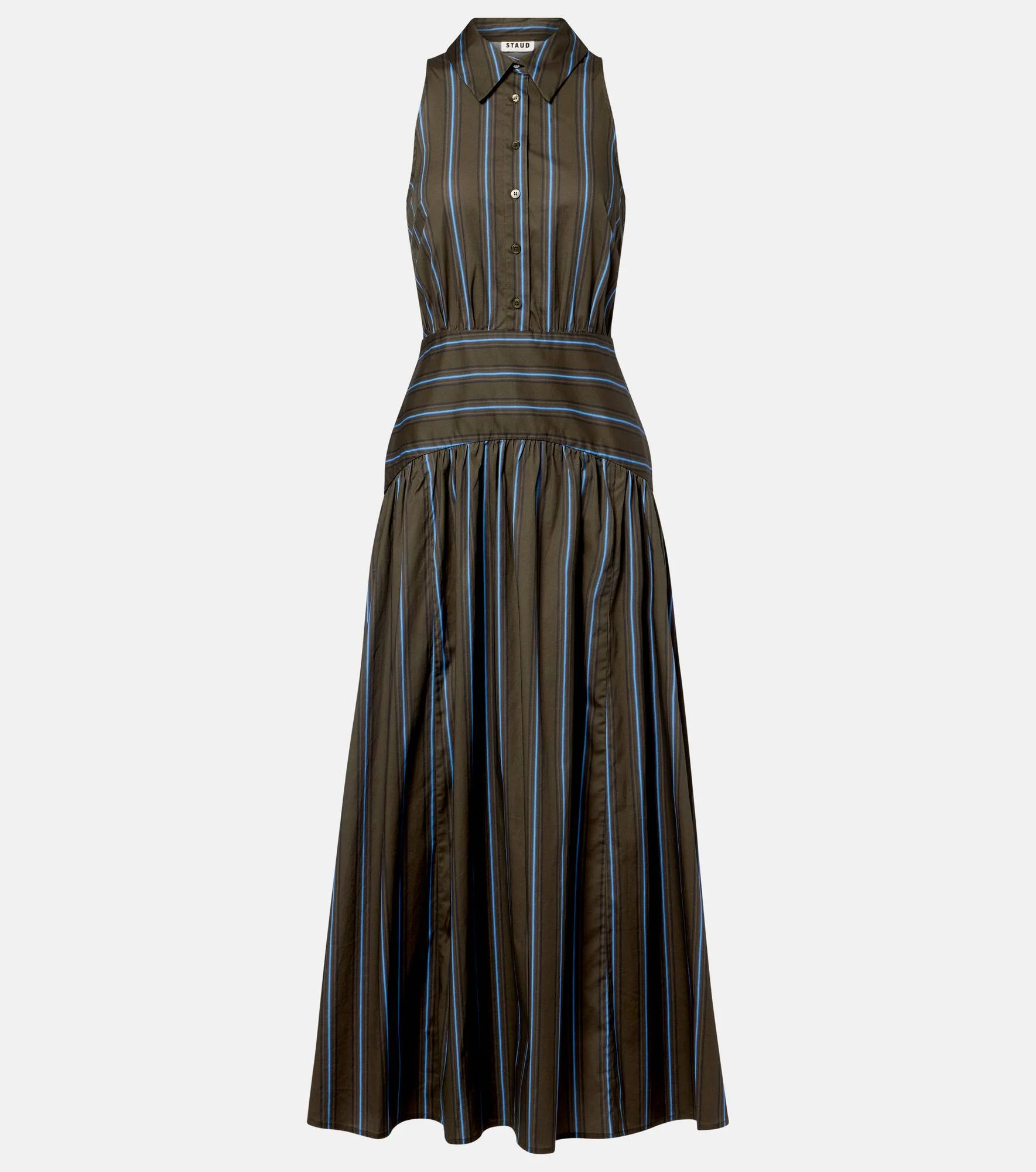 Staud seeks to break through repetition in design with thoughtful styles that are empowering and accessible. The Romy midi dress is crafted from striped cotton and features a shirt-inspired silhouette and a gathered skirt. Product Details - Material: 98% cotton, 2% elastane - Care instructions: machine wash cold - Made in Vietnam - Color: multicoloured - Designer color name: Huntington Stripe - Collar: classic (Straight point) - Closure: partially buttoned front - Item number: P01150878 Size & Fit - True to size - Cinched waist - Non-stretchy fabric - The model seen in the picture is 178cm-5'10" and wearing a size US 4