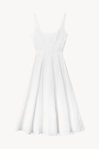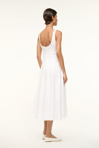 The Wells Dress features a corset-style panel construction to create a flattering, fitted shape through the waist and a midi length a-line skirt. Made out of lightweight cotton poplin.