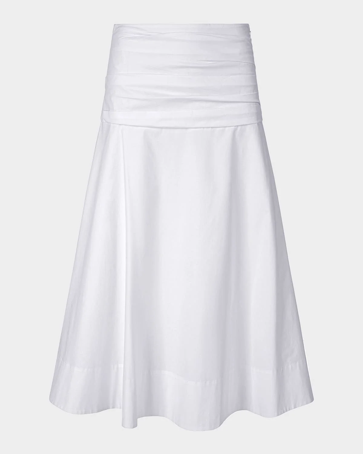 STAUD & apos;s "Sol" skirt is crafted from stretch cotton poplin with strategic ruching at the waist for a flattering, sculpted fit High waist Hem falls below the knee A-line silhouette Side zip closure Cotton/spandex Dry clean Imported SIZE & FITModel measurements: 5 & apos;10" tallModel is wearing a US size 4/Small