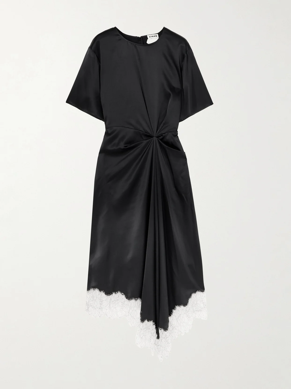 STAUD's 'Sonoma' dress has you covered for dinner or date night. It's bias-cut from smooth silk-blend satin and gathered at the waist to create an asymmetric handkerchief hem, outlined with lace. Team it with sculptural accessories.