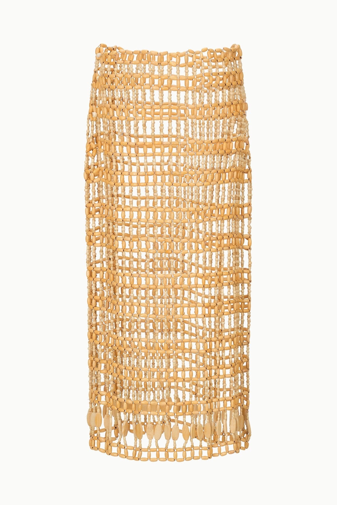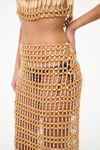 The Abaco is a midi length skirt handcrafted in wooden beads, it can be worn as a see-through skirt or as a swim cover up; it is a slip-on style with a button closure. This can be worn as a matching set with the Thatch Top. MORE DETAILS - 100% Wood Beads - Model is 5'9 and wearing a size S - Dry Clean Only
