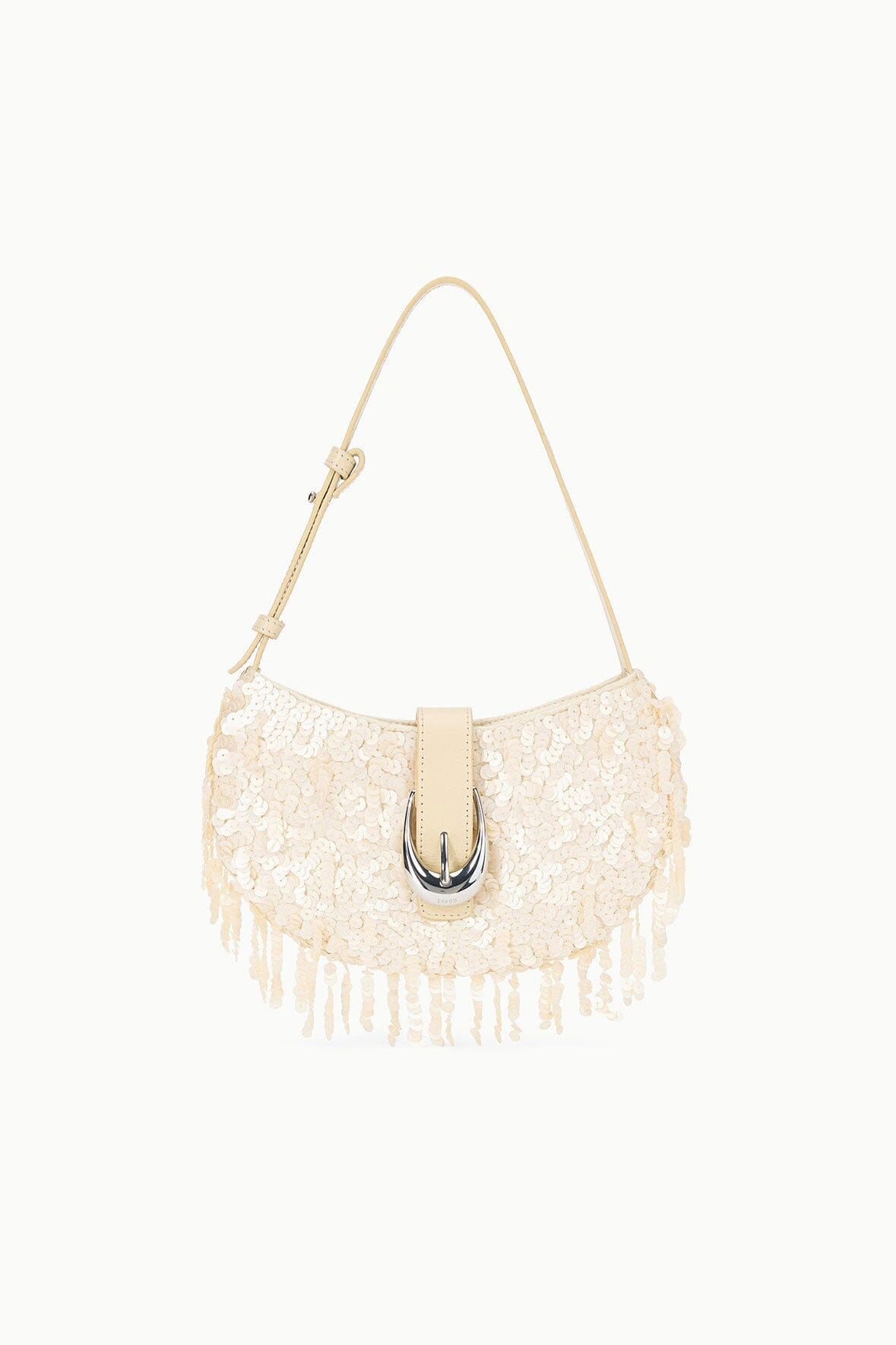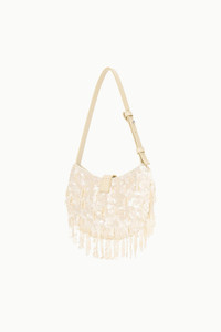 The Alana is a fully beaded crescent-shaped bag with a fringe trim and adjustable shoulder strap. It features our signature moon buckle hardware and a magnetic closure. MORE DETAILS - Sequin Shoulder Bag - Self: 100% Sequins, Lining: 100% Polyester