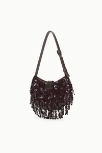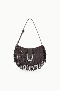 The Alana is a fully beaded crescent-shaped bag with a fringe trim and adjustable shoulder strap. It features our signature moon buckle hardware and a magnetic closure. MORE DETAILS - Sequin Shoulder Bag - Self: 100% Sequins, Lining: 100% Polyester
