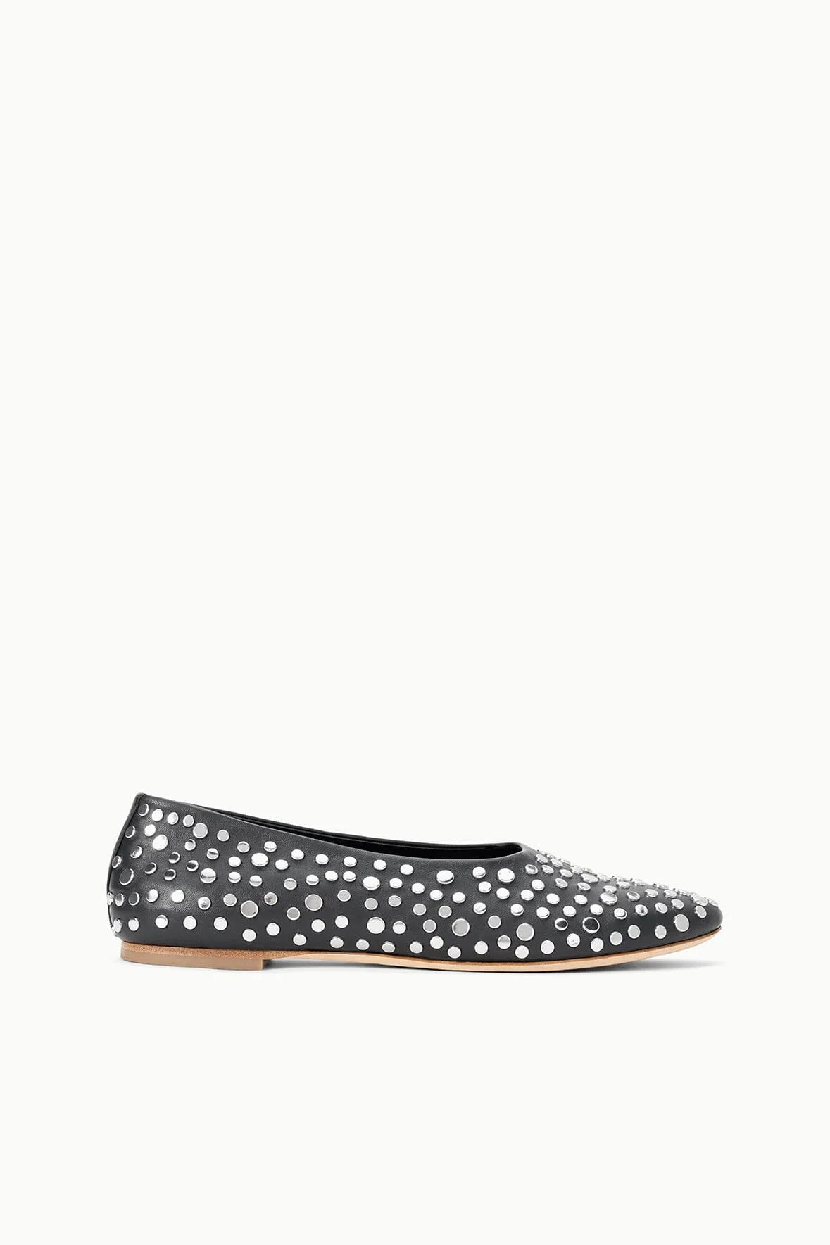 The Alba Ballet Flat is a round toe slip-on flat made from a soft, supple nappa leather updated for the season with silver rivets. MORE DETAILS - Embellished Leather Ballet Flat - Upper: 90% Lamb Leather, 10% Brass, Sole: 75% Cow Leather, 25% Rubber
