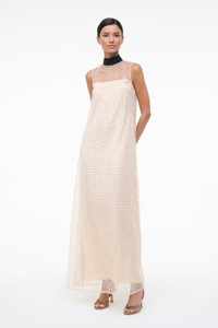 The Albee Dress is an embellished tulle sleeveless dress featuring a high neck with a functional tie in the back. This style is sheer and features an interior slip. MORE DETAILS - Self: 100% Polyester, Lining: 100% Polyester, Core: 60% Cotton, 40% Polyester - Model is 5'10 and wearing a size S - Dry Clean Only