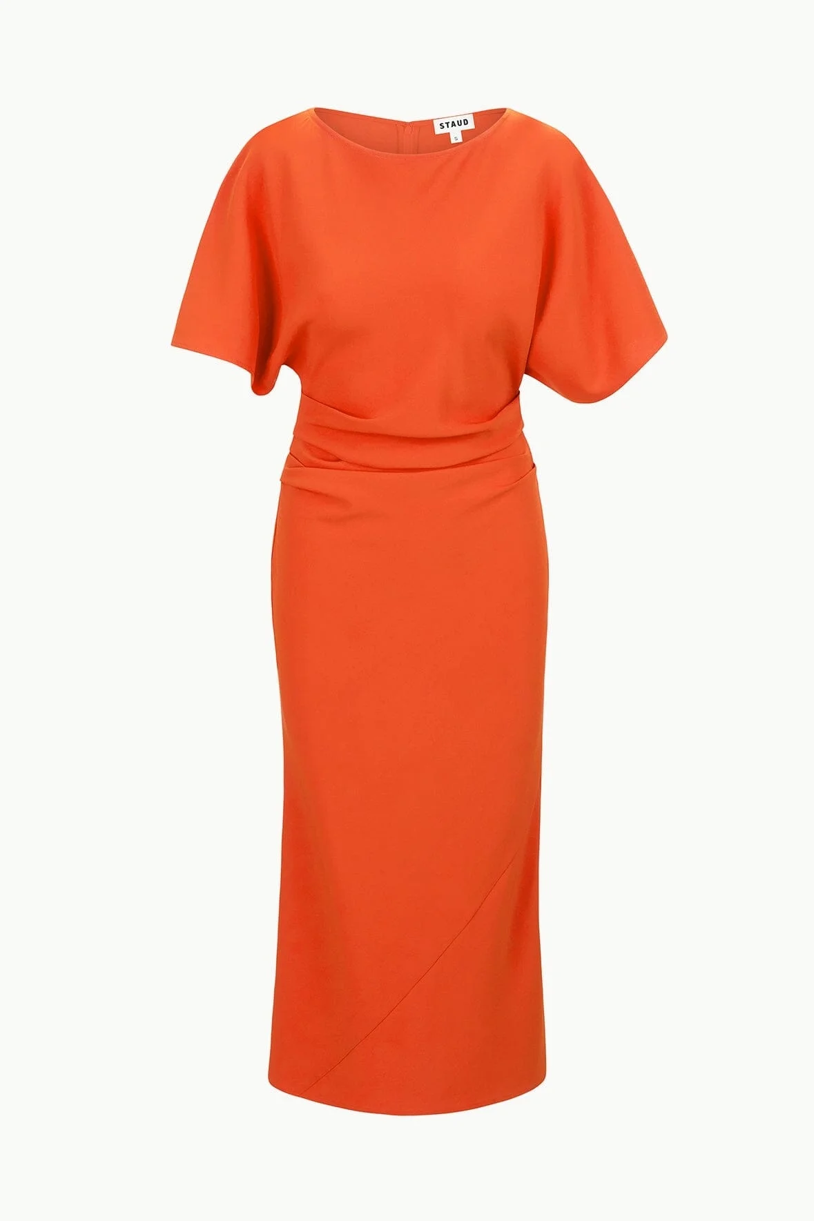 The Amelie is a midi length dress with a boat neckline and dolman sleeves. It features a center back slit and ruching at the waist creates a gentle drape. MORE DETAILS - 70% Acetate, 30% Polyester - Model is 5'10 and wearing a size S - Dry Clean Only