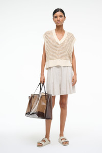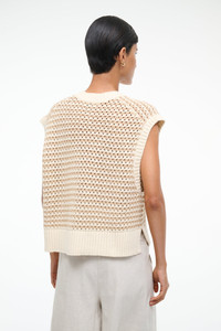 A chunky knit sweater vest with a deep V neckline and cropped fit, this style has been updated with a tonal beige knit body and a cream contrast trim. MORE DETAILS - 60% Cotton, 40% Acrylic - Model is 5'10 and wearing a size S - Dry Clean Only