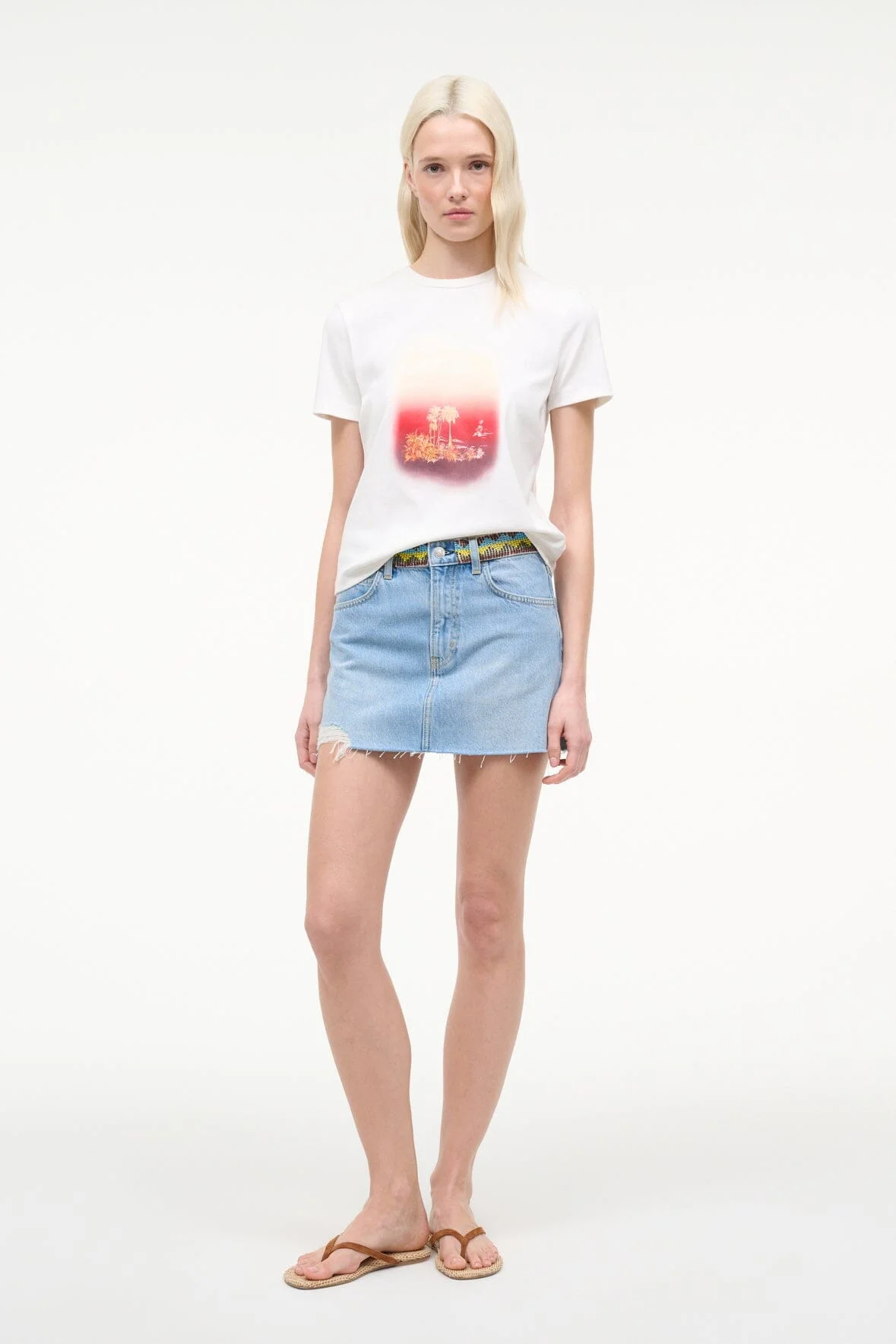 A vintage-washed denim mini skirt featuring a raw edge hem for an effortless, lived-in look. Designed with a button-zip closure and two functional back pockets. A timeless staple that transitions seamlessly from day to night. MORE DETAILS - Fabrication: 100% Cotton, Lining: 65% Polyester, 35% Cotton, Trim: 100% Glass Beads - Care: Machine wash cold, inside out. Lay flat or hang to dry. - Model is 5'10 and wearing a size 25.